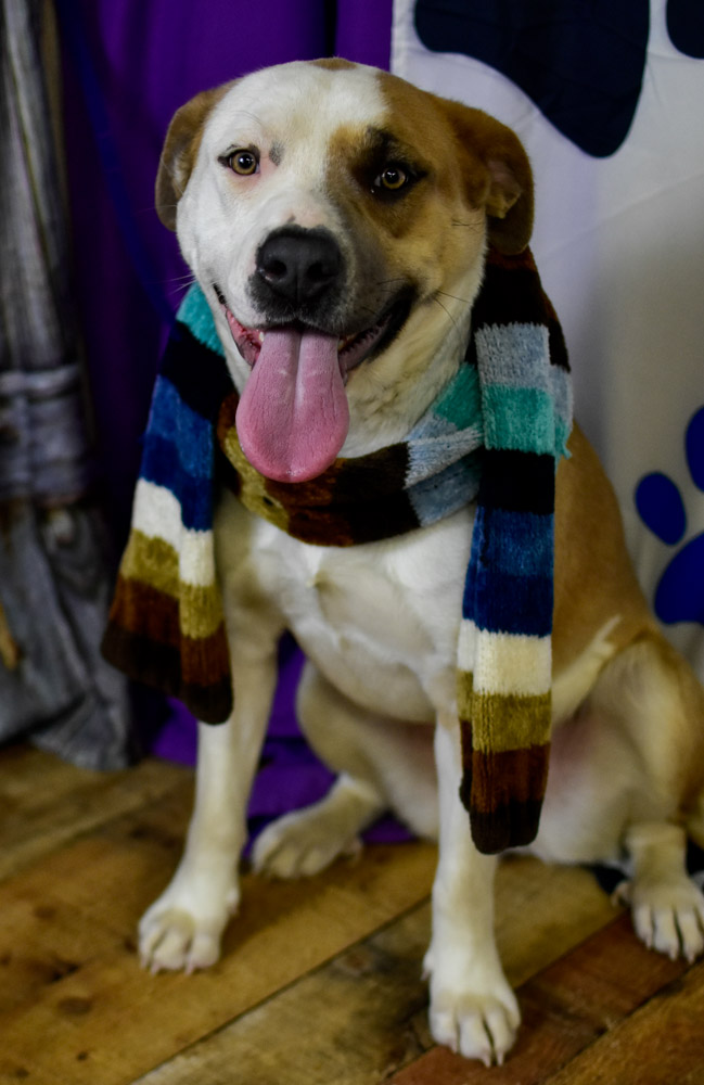 Another gem of a dog is Hope. She is new to the shelter and is still settling into her temporary home, but she’s hopeful that she’ll find her forever family soon, especially once they see her model that scarf we found in the photo barn.