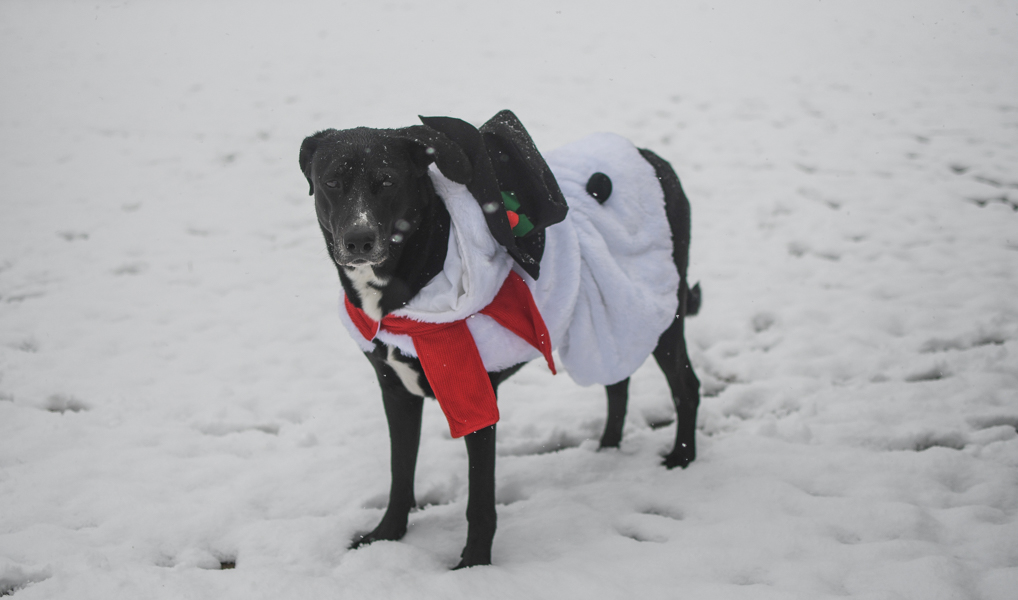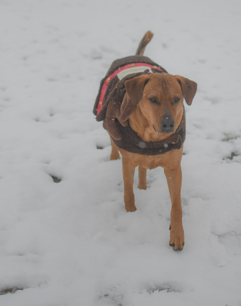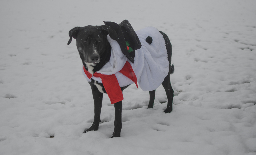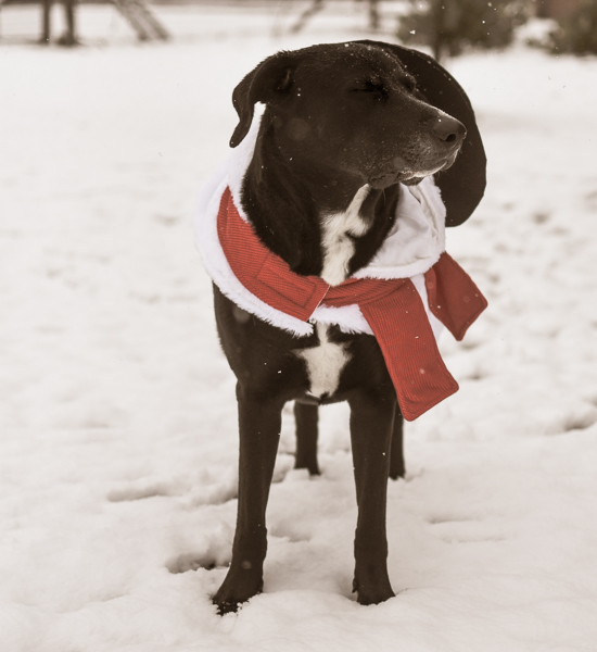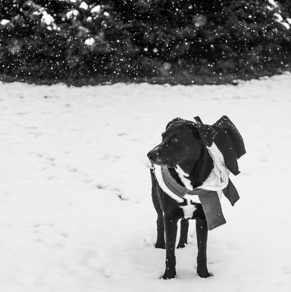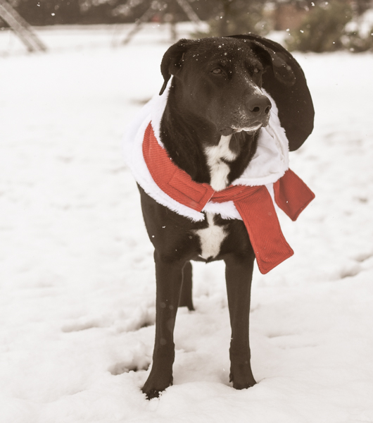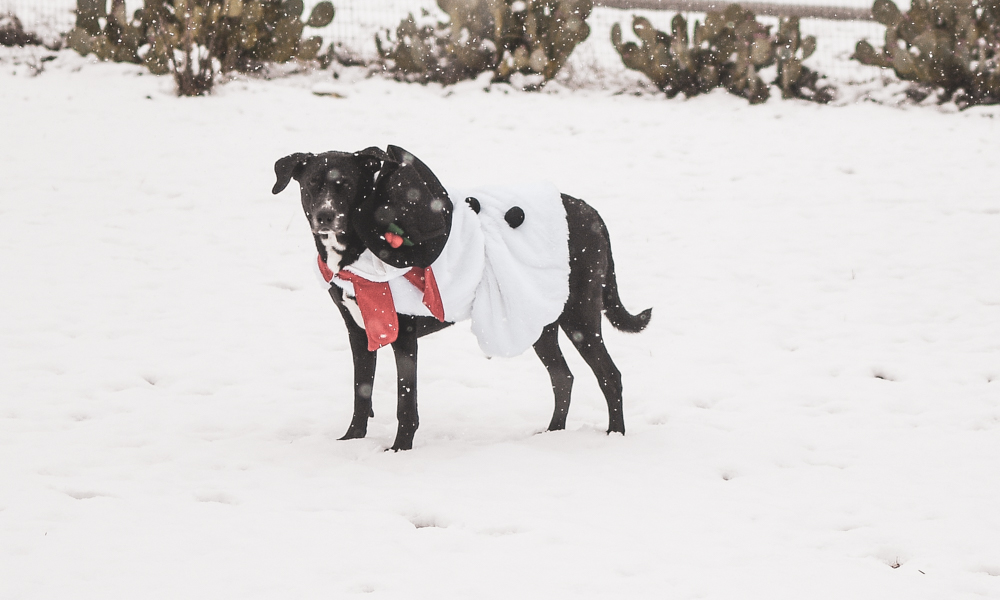 We got some rare snow in Texas yesterday, so I quickly got out my camera and took a few pictures of my two charming canines, Tucker and Gunner, enjoying the winter scenery while casually sporting their fashionable and seasonally appropriate outfits: snowman and reindeer.