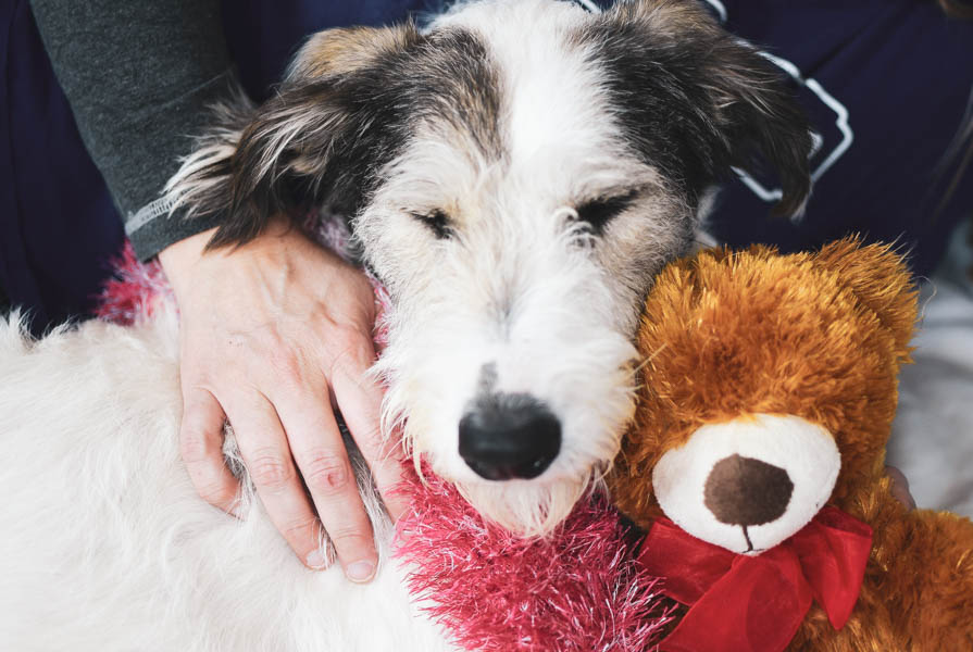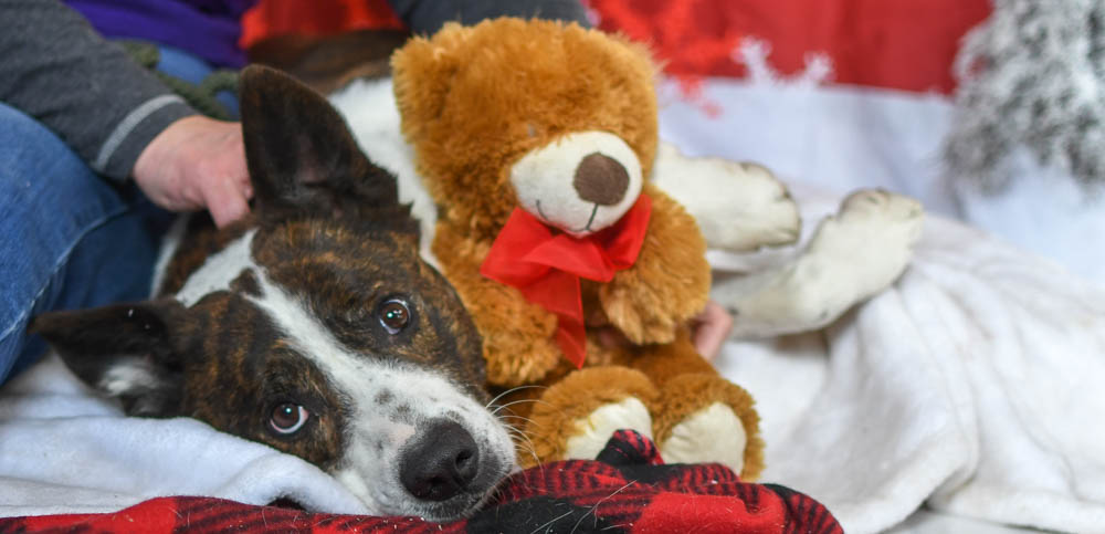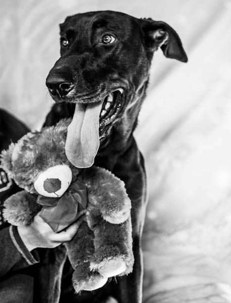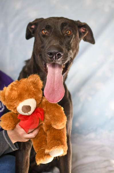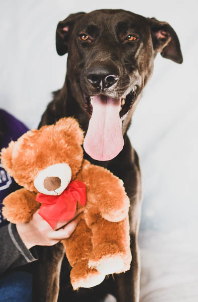 Cowboy thought the best way to show his potential as a couch-warming cuddler was to use his skills during our photo session, and so he enjoyed belly rubs and cuddles while posing with the canines’ favorite red-bow-wearing teddy bear.