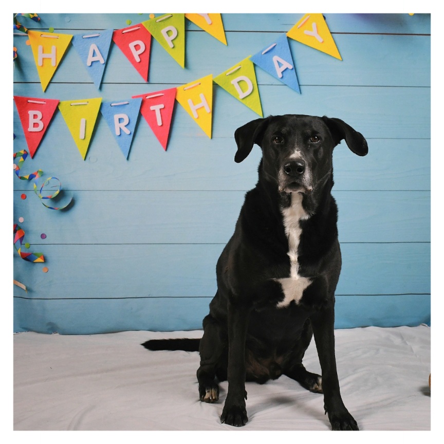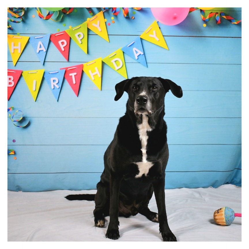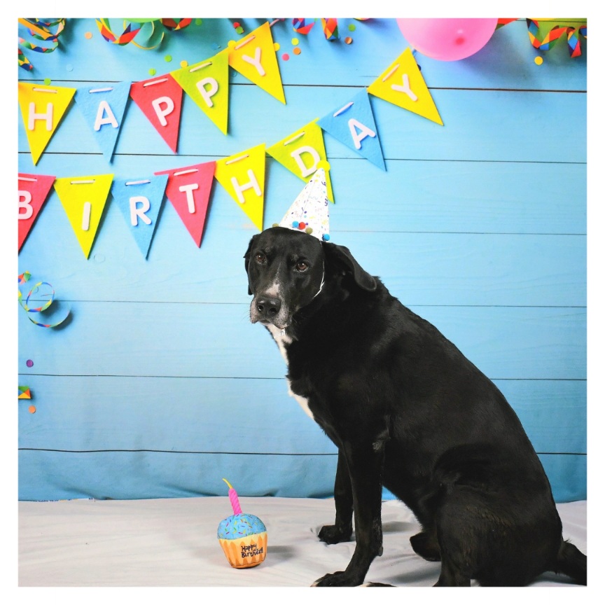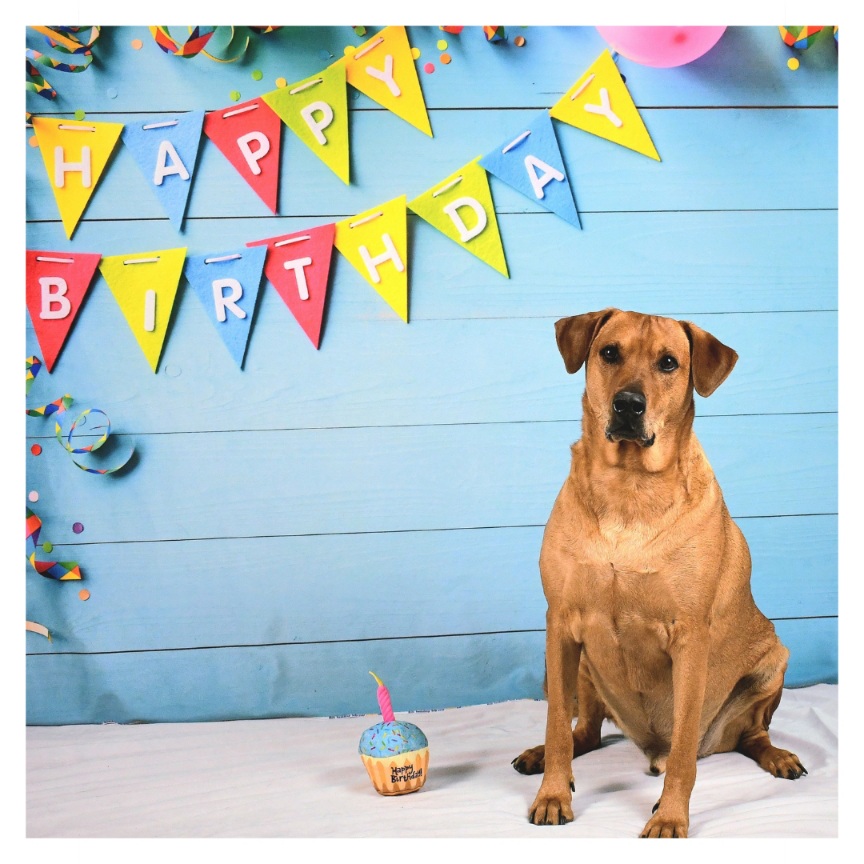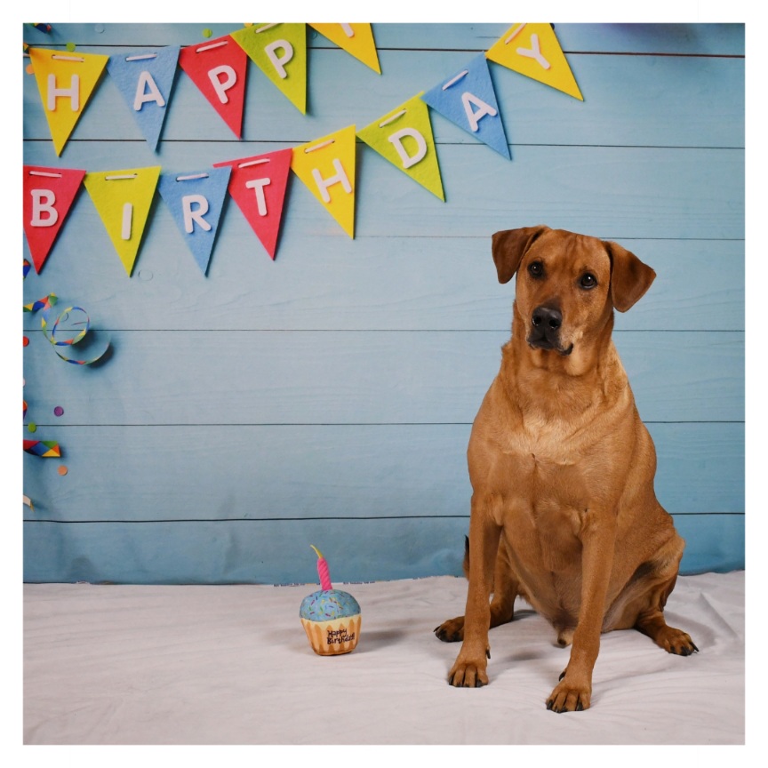 Later in the afternoon, we set up the new birthday-themed photography backdrop my husband had given to me for Christmas, got out the party hats and toys I had ordered for the canines, and snapped a few photos to make Gunner’s birthday truly one to remember.